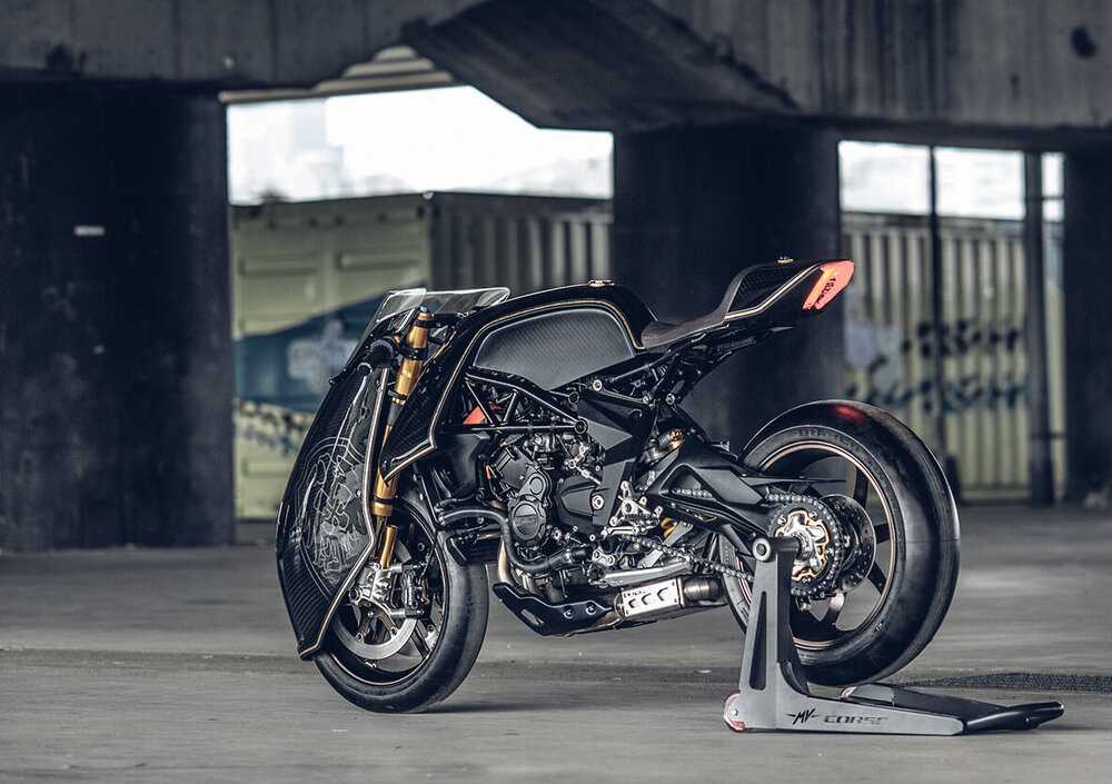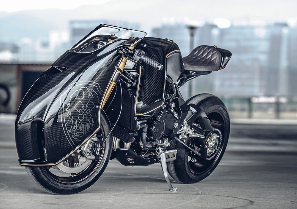 La carenature è stata disegnata al computer, esportata in 3D su un modello in scala uno a uno che è poi servito da stampo. Come materia è stata usata la fibra di carbonio. La strumentazione, di serie poiché integrata al circuito di gestione elettronica della moto, è stata spostata sul dorso del serbatoio, sella e codino sono monoposto e le ruote da 17 di Wukawa Industry sono state scelte appositamente per questo modello. La componentistica vede nomi noti, come la forcella Ohlins FGR 800, il mono TTX sempre Ohlins lo scarico realizzato dalla HP Corse e i freni Beringer. Le pedane arretrate sono di MV Agusta Corse, il manubrio di Bonamici racing, le frecce di Motogadget e la viteria è in titanio.