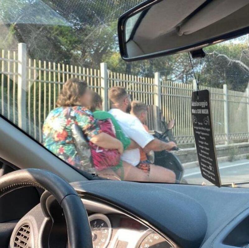 Il figlio piccolo è in piedi sulla pedana piatta dello scooter, il padre guida, le figlia è seduta dietro di lui e, seduta sul portapacchi la madre. Una situazione molto pericolosa, specialmente per due piccoli.