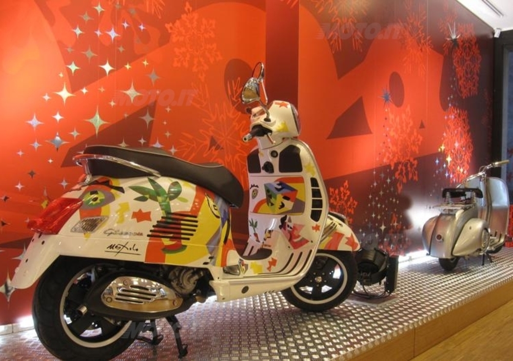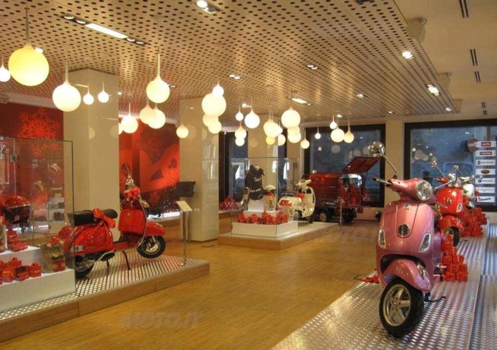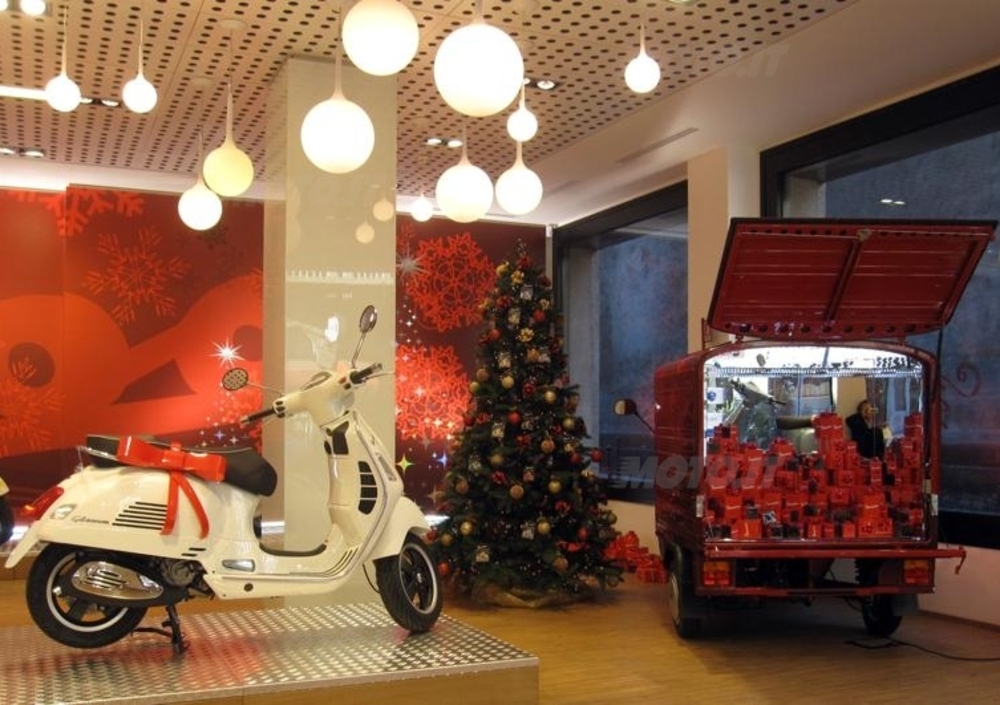 Per l’occasione lo show room milanese del Gruppo Piaggio è allestito con luci e decorazioni nella vivace ed elegante bicromia bianco-rosso, i colori più tipici del Natale, e ospita un allestimento speciale interamente dedicato a Vespa. I visitatori possono ammirare i modelli più amati di Vespa, dalla PX alla GTS 300 Super, Vespa S e Vespa LX, e alcuni pezzi vintage da collezione, tra cui una Vespa 98 del 1947. In esposizione anche una versione speciale di Ape 50 dedicata al Natale, tutta rossa e ricoperta di luci.