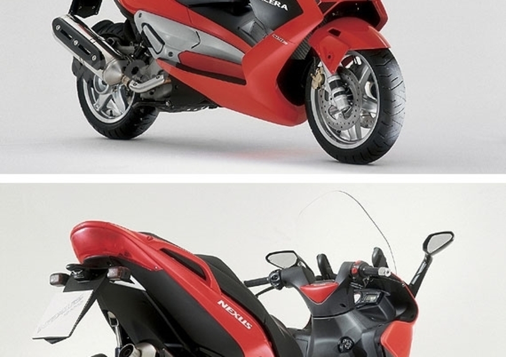 Oltre lo scooter. Più di 40 cavalli di potenza, raffinate soluzioni motociclistiche unite a comodità e facilità di guida, per lo scooter più sportivo che sia mai apparso sul mercato. Quello dei maxi scooter GT è stato il fenomeno di mercato degli ultimi anni. Macchine sempre più comode e potenti hanno avvicinato nuove schiere di appassionati alle alte cilindrate combinando la praticità e la facilità d’uso dello scooter con le prestazioni date da motorizzazioni oltre i 400 cc. Con Gilera Nexus, il primo Maxi Supersport, nasce il Granturismo Sportivo. L’anima Gilera, applicata al maxi scooter, ha prodotto lo scooter più sportivo mai apparso sul mercato. Un progetto unico nella classe “mezzo litro”, concepito per l’emozione e il piacere della guida sportiva. Gilera Nexus risponde a una filosofia precisa: portare nel mondo degli scooter i contenuti di sportività propri del marchio Gilera, attingendo a piene mani soluzioni tecniche dal mondo della moto ma senza rinunciare alla semplicità di utilizzo dello scooter. Una missione che Gilera porta avanti dal 1997 quando Runner rivoluzionò il settore scooter introducendo una tecnologia telaistica ripresa dal mondo delle moto, al fine di esaltare il piacere di guida. Gilera Nexus è la declinazione alla massima potenza di quel progetto. Ogni scelta tecnica ed estetica adottata su Nexus è funzionale all’obiettivo finale: realizzare lo scooter più sportivo e performante che sia mai esistito. Capace di prestazioni che lo collocano al vertice della categoria scooter. Un progetto che, uscendo dagli schemi tradizionali ha richiesto la realizzazione di soluzioni tecniche assolutamente inedite e originali. Pochi numeri sintetizzano il carattere di Gilera Nexus : 195 kg di peso, ripartiti 48% all’anteriore e 52% al posteriore, spinti da un sofisticato motore a iniezione elettronica da oltre 40 cavalli. Ma molto di più raccontano le soluzioni tecniche di assoluta originalità di cui Nexus è ricco. A cominciare dalla ciclistica: la raffinata sospensione posteriore progressiva “Power Drive” si sposa al sistema di fissaggio del motore al telaio “Direct Link”, che conferisce nuova rigidità a tutto il sistema. E, per la prima volta per uno scooter, arriva la possibilità di regolazione della geometria e dell’assetto posteriore, per adeguare la guida ai gusti del pilota. Lo stile Sportivo. Niente giri di parole, niente mezze misure. Gilera Nexus si propone agli appassionati come lo scooter più sportivo mai esistito. Comodo e protettivo come ci si aspetta da un maxi scooter, Nexus esibisce forme che parlano un linguaggio motociclistico. La carenatura veste una meccanica poderosa lasciandone però in vista i muscoli da velocista. Il frontale aggressivo è fortemente caratterizzato dai fari affilati e dalla presa d’aria centrale. Sotto i fari la carena si spezza in linee nervose, proiettate verso la ruota anteriore, che trasmettono una forte sensazione di dinamicità. Gli studi in galleria del vento hanno permesso di coniugare ottimi valori di penetrazione aerodinamica e elevata protettività, garantita anche dalla possibilità di regolazione del parabrezza su tre diverse posizioni, per adattarlo alla taglia del pilota e garantire il miglior comfort. Gli specchietti retrovisori, affilati e completi di indicatori di direzione, contribuiscono alla “leggerezza” complessiva del design. La carena si raccorda in basso con la pedana che corre ai lati del tunnel centrale impreziosito dagli elementi in alluminio e chiuso, verso l’alto, dall’alloggiamento per il tappo serbatoio, anch’esso in perfetto stile motociclistico. Sul tunnel centrale sono ricavati gli sfoghi dell’aria calda, una soluzione ereditata dalla serie Runner che consente, nei mesi invernali, di convogliare calore sulle gambe del pilota. Alle forme piene dell’anteriore si contrappone il codino che, affilato e sfuggente, dona ulteriore leggerezza e sportività al design complessivo sottolineando, anche in senso estetico, la formidabile ripartizione dei pesi che caratterizza Nexus. La sella ampia e comoda anche per il passeggero, induce a una posizione di guida estremamente naturale e accresce la sensazione di facile e totale controllo. Sotto la seduta è ricavato il vano portaoggetti capace di contenere un casco integrale e completo di luce di cortesia e presa elettrica per la ricarica del cellulare. L’apertura sella, oltre che dal pulsante elettrico nel controscudo, può essere azionata dall’innovativo telecomando integrato nella chiave di accensione. Spazio ulteriore è ricavato nel controscudo. Sono comodità irrinunciabili per l’utente scooter, anche su un veicolo sportivo come Gilera Nexus. La strumentazione, illuminata in “rosso Gilera” associa a un design ispirato allo sport, una straordinaria completezza: accanto a tachimetro e contagiri analogici, il display elettronico fornisce dati su livello carburante, temperatura del liquido di raffreddamento, tensione batteria, consumo medio e istantaneo, autonomia, chilometraggio totale e parziale e sulle velocità media e massima raggiunte. Visualizza al pilota ora e data e segnala gli interventi programmati di manutenzione. Il selettore che comanda le funzioni del computer di bordo è posto sulla manopola destra e consente quindi di passare da una funzione all’altra senza mai staccare la mano dal manubrio. Gilera Nexus è dotato di serie del dispositivo di sicurezza Immobilizer che impedisce l’avviamento con una chiave (anche se meccanicamente valida) non riconosciuta elettronicamente dalla centralina di controllo motore. La ciclistica E’ nella ciclistica che Nexus racchiude molte delle soluzioni tecniche che lo distinguono da tutti gli altri scooter. Con l’obiettivo di garantire emozioni sportive, agilità straordinaria ma, al tempo stesso, mantenere la sicurezza e la stabilità alle alte velocità, i tecnici Gilera hanno progettato un telaio a doppia culla in traliccio di tubi d’acc