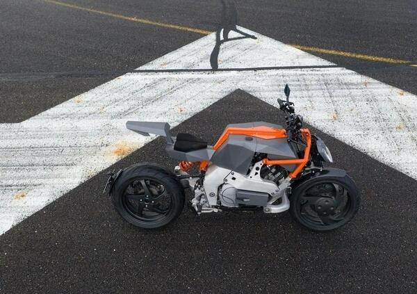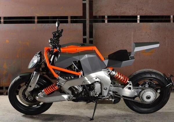 Il risultato lo vedete da voi: sugli attacchi originali della carrozzeria, una struttura in tubi arancione irrigidisce la ciclistica e fa da raccordo con il coperchio in alluminio che nasconde il serbatoio. Il codino è un'unità autoportante. L'insieme, un po' per la colorazione e un po' per le linee tese e taglienti, ricorda molto... una supernaked austriaca. Che dite?