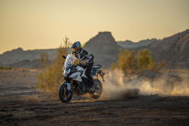 Il comparto ciclistico vede lavorare una forcella a steli rovesciati da 43mm completamente regolabile nel precarico delle molle e nei freni idraulici con funzione separata in compressione e in estensione tra i due steli. Il mono, che non agisce su leveraggio progressivo, è collegato direttamente tra telaio e forcellone ed anch’esso è completamente regolabile nel precarico e nei freni idraulici. La sella dista 845mm da terra e il peso della CFMOTO 700MT raggiunge quota 207 kg a secco.