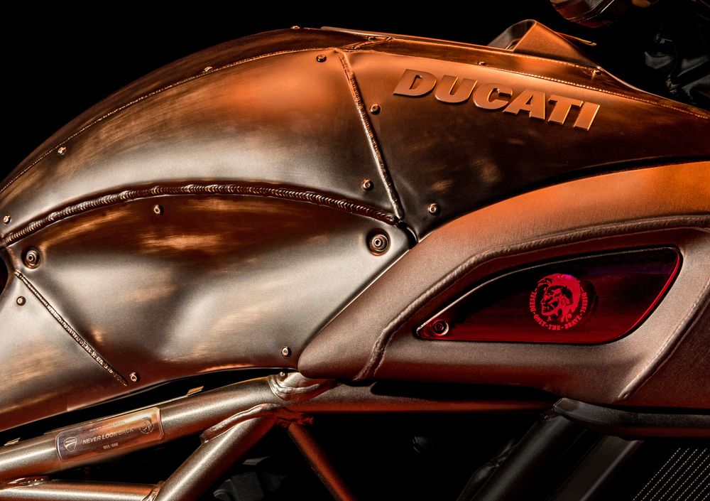 La Diavel Diesel trae ispirazione nell'immaginario post apocalittico, giocando con elementi rétro e futuristici. Il colore scuro, sfumato e materico, è usato per le sovrastrutture in acciaio spazzolato. La cover del serbatoio ha saldature e rivetti in vista, e la stessa lavorazione riguarda il piccolo cupolino e il coprisella. Contrastano e integrano l'estetica la sella in pelle trapuntata color cuoio, le cover dei convogliatori ai lati del serbatoio in metacrilato rosso e, sempre in rosso, le pinze dei freni Brembo, il cruscotto LCD e cinque maglie della catena di trasmissione. Unico è anche lo scarico con i fondelli dei silenziatori lavorati dal pieno e i tubi con rivestimento ceramico Zircotec.