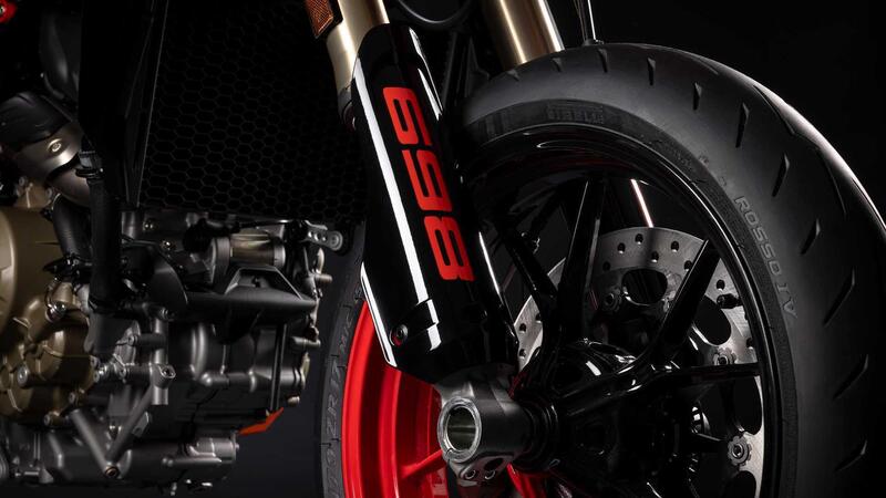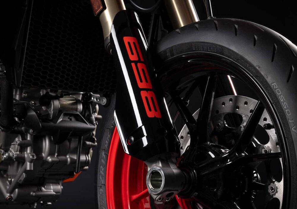 L’impianto frenante anteriore conta su un disco singolo da 330 mm sviluppato specificamente da Brembo per la Hypermotard 698 Mono, con pinza radiale Brembo M4.32. Al posteriore lavora un disco singolo da 240 mm, anch’esso con disegno dedicato.