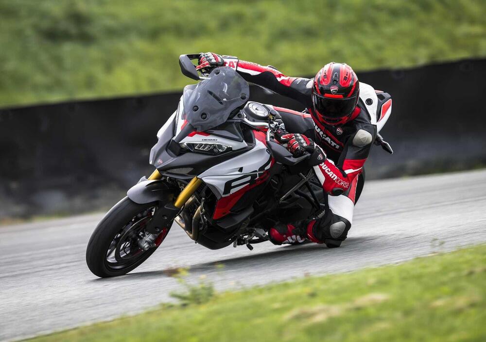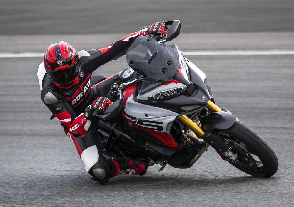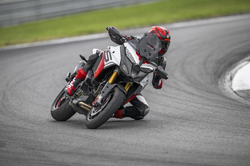 Telaio monoscocca in alluminio e ruota anteriore da 17 pollici: la ricetta Ducati per eccellere dinamicamente non cambia, ma qui il telaio è diverso da quello delle Multistrada V4 S e Rally, allo scopo di ottenere un’inclinazione del cannotto di sterzo differente (25,75° rispetto a 24,5°) definendo quote ciclistiche di avancorsa e interasse in funzione della maggior sportività della moto, in analogia a quanto già fatto sulla V4 Pikes Peak.