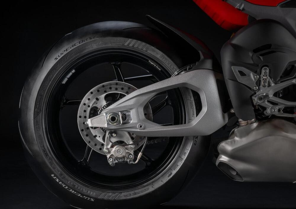 Nel 2022, Francesco Bagnaia in sella a una Panigale V4 S dotata solamente di pneumatici slick ha staccato il miglior cronologico della Race of Champions in 1’35”8, a quattro secondi dal record della MotoGP di quell’anno, ovvero 1’31”868, stabilito da Enea Bastianini su Ducati DesmosediciGP. Per avvicinarsi ancora alle prestazioni della MotoGP, d’accordo con Ducati Corse, si è scelto di adottare lo stesso schema per il forcellone, lavorando con i designer del Centro Stile per conferire al pezzo la raffinatezza stilistica patrimonio di tutte le Ducati. Il nuovo forcellone Ducati Hollow Symmetrical Swingarm è caratterizzato da bracci laterali dal design alleggerito e ampie asole sui lati, con struttura scatolata interna svuotata per maggior leggerezza. Il cursore tendicatena sul lato sinistro è in alluminio ricavato dal pieno per sopportare i carichi derivanti dal tiro catena.