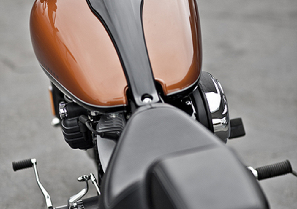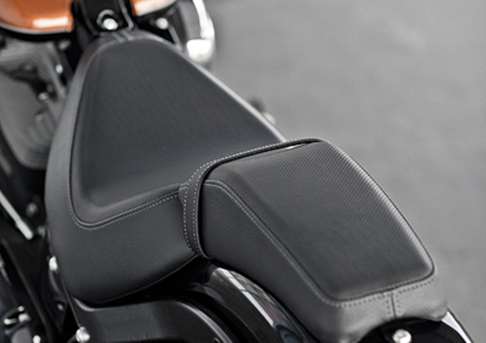 • NUOVA profonda sella biposto con sellino passeggero integrato. L'altezza della sella da terra è pari a 660mm, il valore più basso mai visto su un modello Harley- Davidson®. Lo spazio presente tra la punta della sella e il serbatoio lascia in bella vista il lato superiore del telaio.