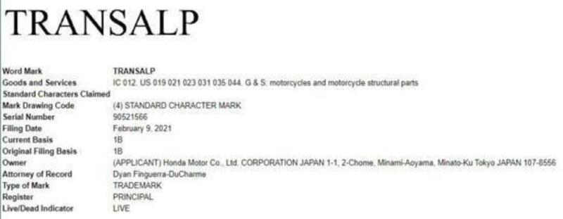 All'inizio di quest'anno il nome Transalp è stato registrato nuovamente negli USA, presso lo United States Patent and Trademark Office, dove il nome era stato registrato la prima volta da Honda Motor nel 1988 ed era rimasto protetto fino a maggio 2016, quando era stato cancellato dal registro dei marchi.
