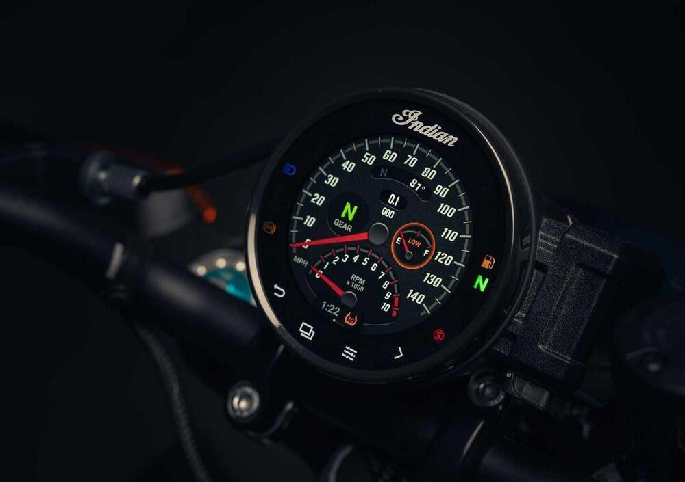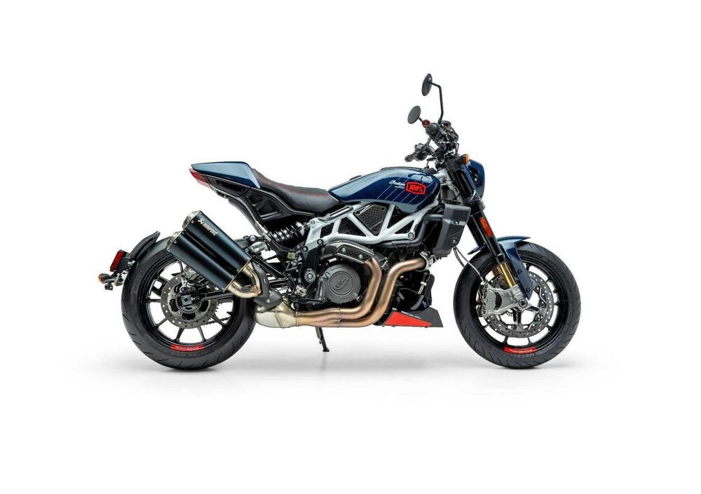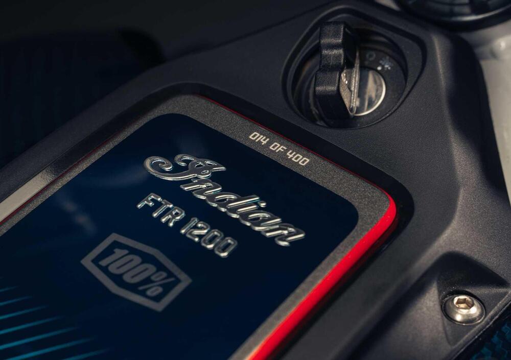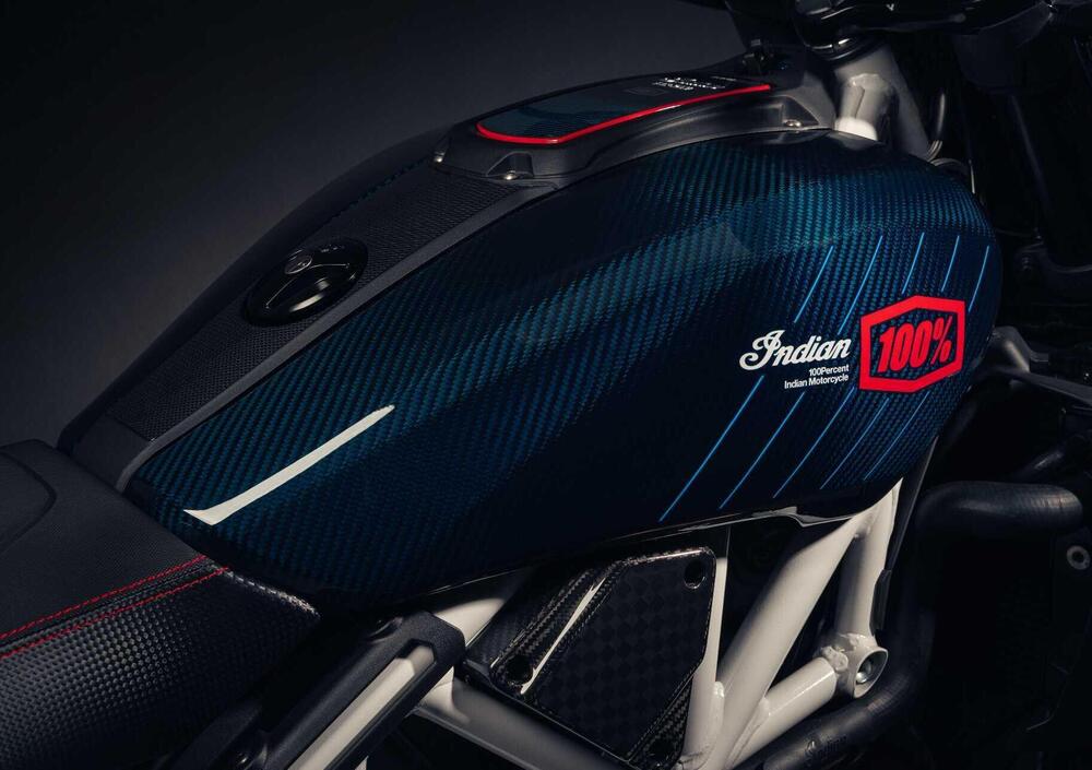 A impreziosire la FTR x R100% Carbon arrivano le firme in co-branding Indian Motorcycle e 100% sul serbatoio, oltre a molti dettagli in fibra di carbonio realizzati in versione peculiare per questo allestimento: cover del faro anteriore, coprisella posteriore e puntale inferiore. Troviamo inoltre una forcella Öhlins un monoammortizzatore posteriore in colorazione dedicata, mentre spicca sul lato destro lo scarico Akrapovic in titanio con finitura nera. Altre chicche sono i componenti in fibra di carbonio come i coperchi del motore, paracatena e protezione dello scarico o i contrappesi manbrio, tappo olio e tappo radiatore firmati Gilles Tooling.