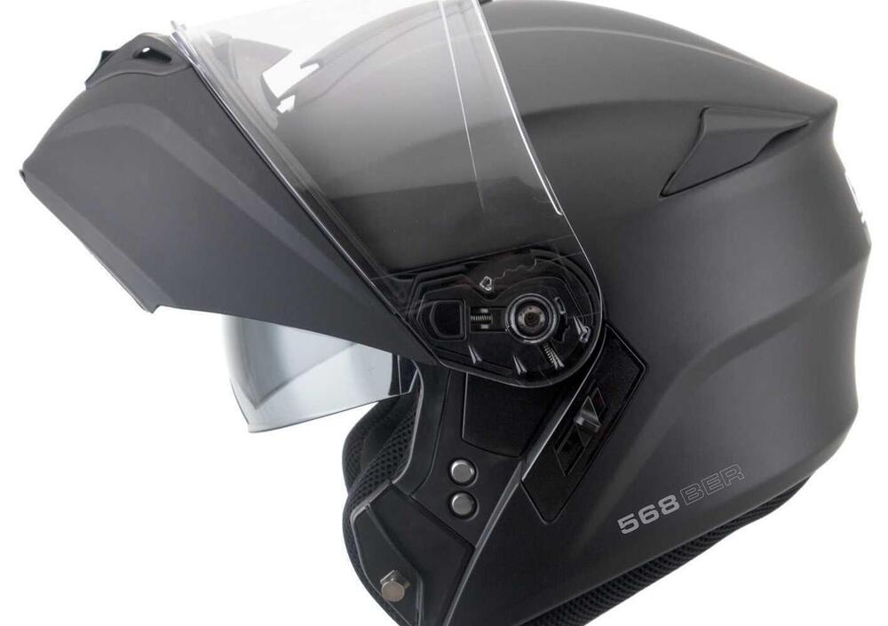L’altro candidato è il modulare 568 BER, un casco apribile dotato di doppia omologazione P/J, calotta in termopolimeri realizzata in due misure, ampia ventilazione, interni removibili, predisposizione per l’alloggiamento dell’interfono, doppia visiera, tutti i deflettori coprimento, paranuca e paranaso. Anche in questo caso non manca davvero nulla per garantirsi un prodotto davvero super completo disponibile dalla taglia XS alla XXL con un peso medio dichiarato in 1600 +/-50g decisamente interessante per un casco apribile. Molto buono il rapporto qualità/prezzo visto che il casco è venduto a partire da 178 euro nella versione monocolore e per le versioni con grafica a 190,00 euro