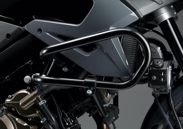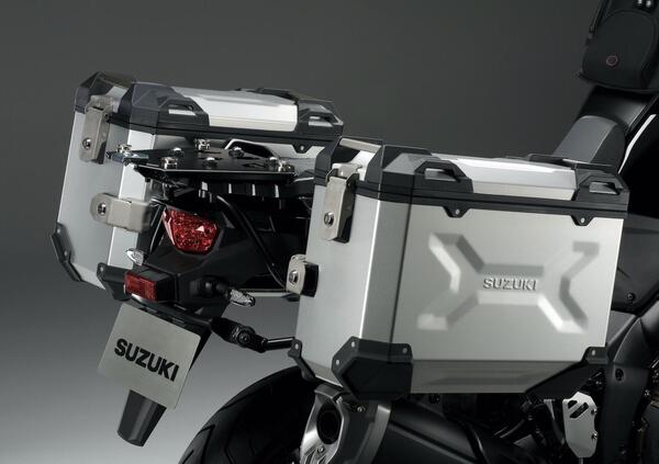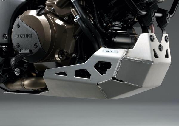 Il pacchetto comprende una serie di accessori originali per aumentare praticità, la capacità di carico e soprattutto la protezione degli organi meccanici, rendendo la moto più adatta all'uso impegnativo in offroad. Si parte dal paramotore in alluminio, che protegge il lato inferiore della meccanica schermando gli impianti di scarico e di lubrificazione senza però ostacolare il raffreddamento. Ci sono poi le barre paramotore alte, giocoforza diverse da quelle che equipaggiano la versione V-STROM 1050 XT standard per la presenza del paracoppa inferiore, che abbracciano radiatore e convogliatori proteggendoli da un'eventuale caduta.