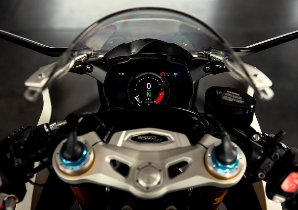 Le regolazioni dell'intervento idraulico sono possibili anche in movimento dalla strumentazione TFT da 5 pollici a colori. I pneumatici diventano i Pirelli Diablo Supercorsa SP V3, mentre il telaio, il telaieto e il forcellone monobraccio - tutti costruiti in lega di alluminio – sono gli stessi della 1200RS e con un peso inferiore del 17% nei confronti con la precedente Speed Triple.