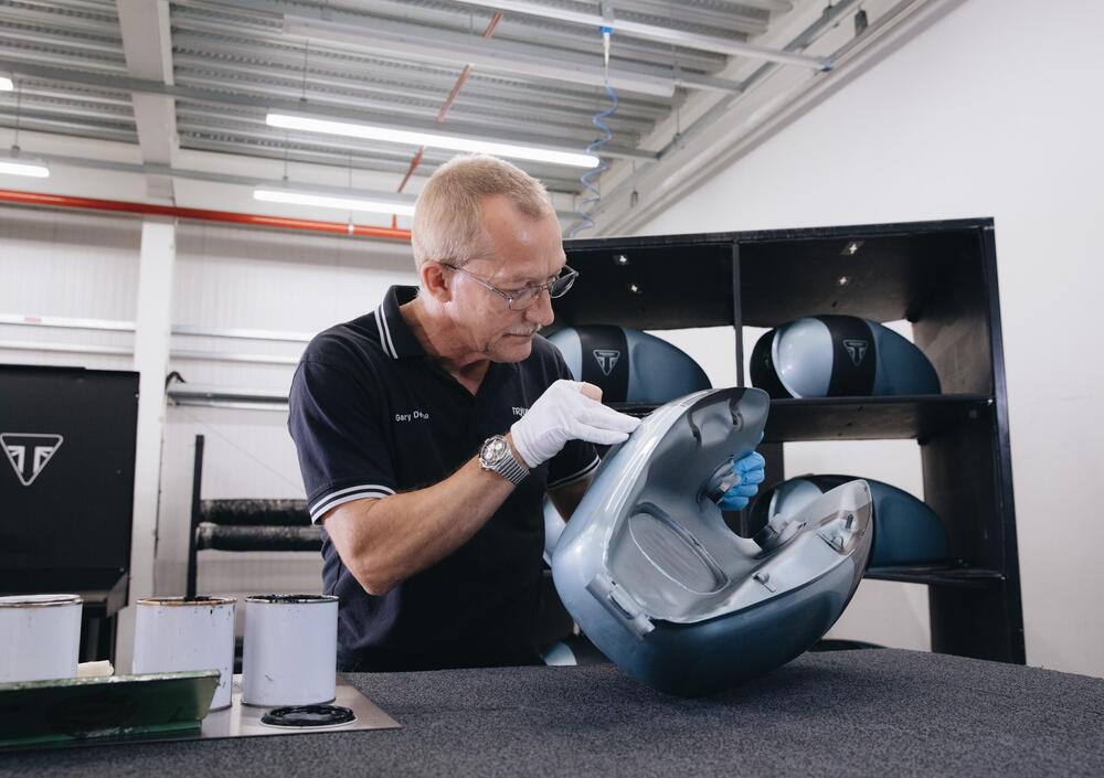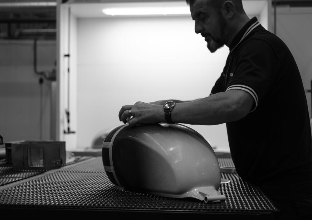E' poi completato da dettagli realizzati a mano da Gay Levine, uno dei componenti del Triumph Paint Shop, da faro e fianchetto in tinta jet black.