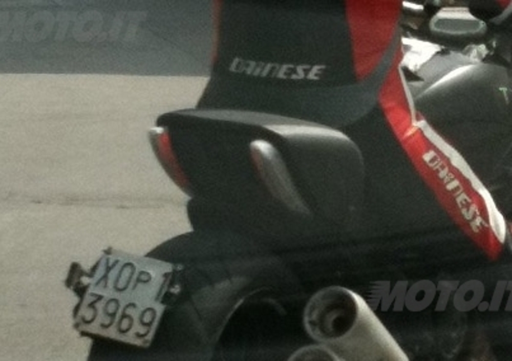 Fermi ad un incrocio, una moto aspetta il verde di un semaforo, nulla di strano. Poi qualche particolare non torna e insospettisce lo sguardo esperto di un nostro lettore, Alessandro Tallia, che rapido scatta una foto a quella che ha subito riconosciuta come l'ultima nata di casa Ducati, la maxi naked già soprannominata Mega-Monster.