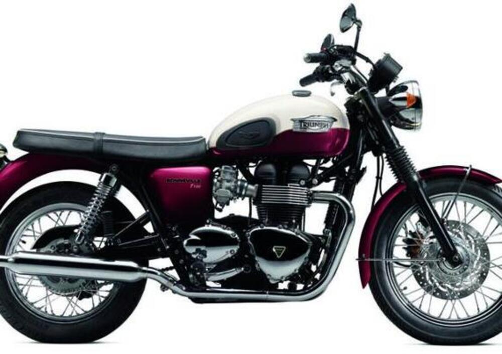 Anche la Bonneville T100, con i suo inconfondibili cerchi a raggi, viene proposta nei colori two tone Graphite/Phantom Black e Cranberry Red/Fusion White. Tutti i filetti di colore che rifiniscono la doppia tonalità delle moto sono verniciati a mano. Completa la gamma delle Bonneville T100 la T100 Black.