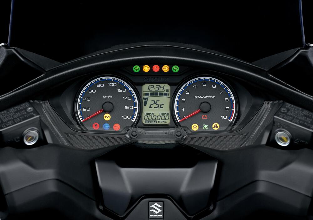 Novità anche per quanto riguarda la strumentazione: ai due classici strumenti circolari è abbinato un display centrale e vengono aggiunti l'indicazione per il Traction Control (altra novità), la spia di allarme ghiaccio (interviene a 3 gradi sotto lo zero e sopra i 5°) e l'indicatore "Eco Drive" che s’illumina nel contagiri quando si utilizza lo scooter con una guida attenta ai consumi. Il Burgman 400 pesa in ordine di marcia 218 kg e la capienza del serbaotio carburante è di 13,5 litri.