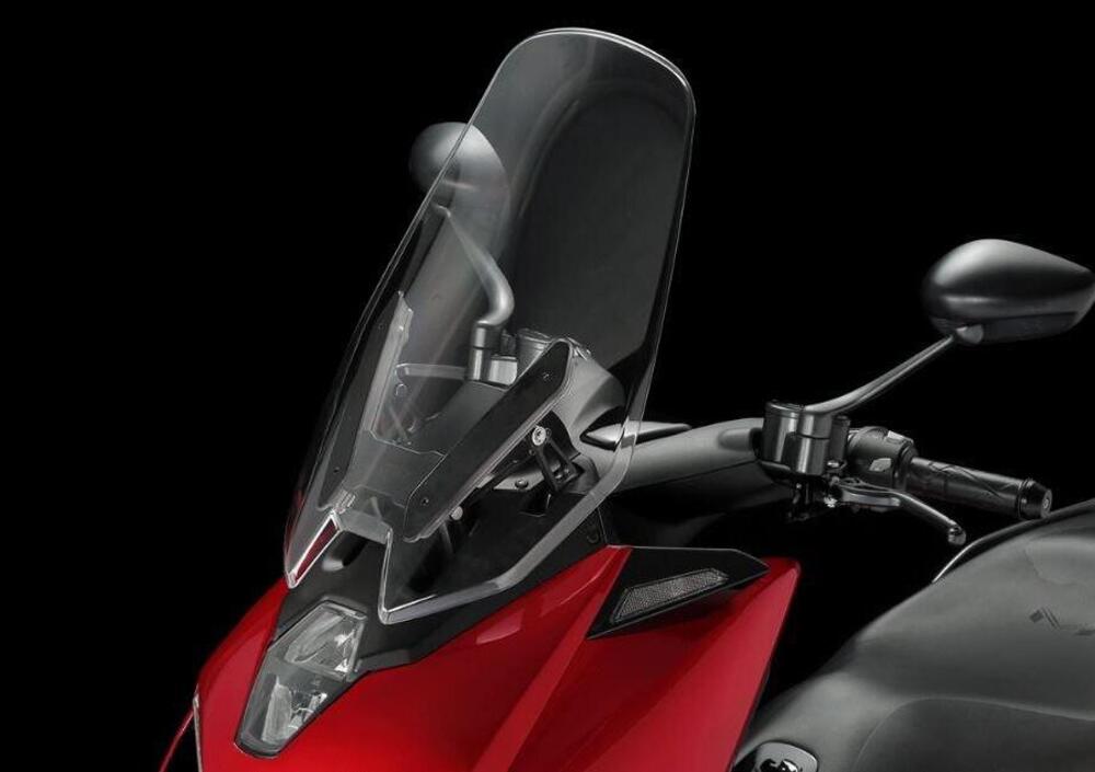 La strumentazione è una TFT a colori con illuminazione autoregolante, il manubrio ha attacchi nascosti per la staffa porta smartphone e ci sono due prese di ricarica rapida 3.0. L'avviamento è con sistema keykless di seconda generazione (dialoga con lo scooter anche con batteria scarica) e ci sono i sensori per la pressione dei pneumatici con relativi avvisi di allarme.