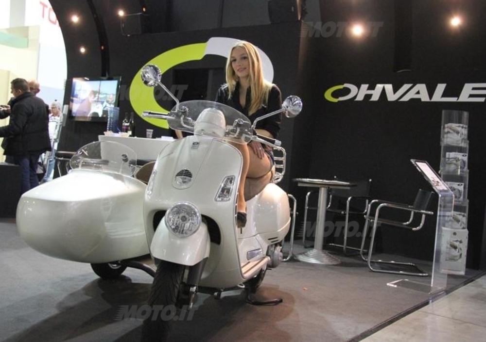 A EICMA Ohvale espone anche il raffinato sidecar su base Vespa. Dotato di freno a disco aggiuntivo e rapportatura accorciata (raggiunge i 100 km/h), ha raccolto molti consensi in virtù di un design molto elegante e di finiture semplici, ma curate.