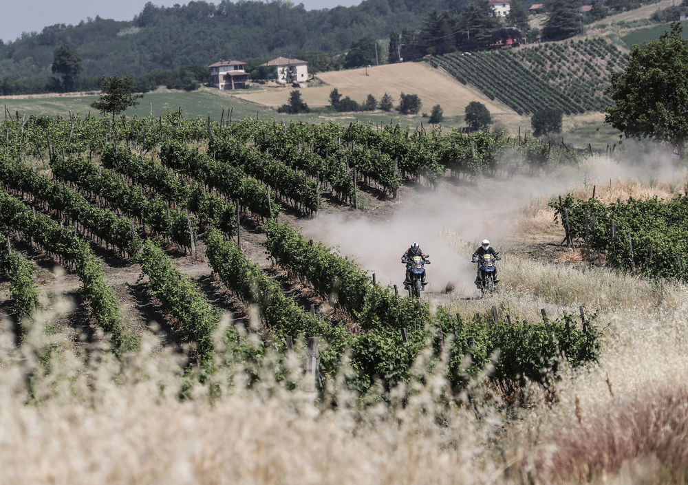Questo grazie “all’esperienza” che piano piano aumenta nella lettura del Tripy. Arriviamo a Tortona, cominciano le prime colline e contemporaneamente le prime salite e discese, su asfalto ma anche su sterrato. Mai ci saremmo aspettati di percorrere cosi tanto fuori strada in questo evento. In realtà l’organizzazione dichiara una percentuale del 30% sul totale del percorso, ma la sensazione è di stare sempre off road.