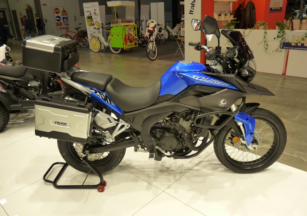 L’attuale gamma Over punta su alcuni scooter di piccola cilindrata e su uno scooterino elettrico. Ma allo scorso EICMA Pelpi International avrebbe dovuto presentare anche un paio di motoleggere davvero interessanti, in quanto adatte ad un pubblico molto giovane. Purtroppo però per motivi logistici la bella naked I-Drake 125 non è arrivata in tempo. C’era invece l’interessante Tourer , una elegante monocilindrica da 250 cc completamente accessoriata per i viaggi, che arriverà il prossimo febbraio. Il suo stile è quello di una moderna enduro stradale (evidentemente ispirata ad altri modelli di alta cilindrata ben noti di questo segmento), spinta da un motore ovviamente a 4 tempi, raffreddato a liquido e alimentato a iniezione elettronica, con cambio a 6 marce. La potenza è di 25 cv a 9.000 giri, con un picco massimo di coppia di 2,3 kgm (22,5 Nm) a quota 7.000. Da notare il telaio perimetrale in lega leggera, le ruote a raggi da 21” davanti e 18” dietro, con gomme da 90/90 e 130/90 e dischi freno a margherita con tubazioni aeronautiche, la forcella a steli rovesciati e il forcellone posteriore (pure in lega leggera) con sospensione monoammortizzatore.