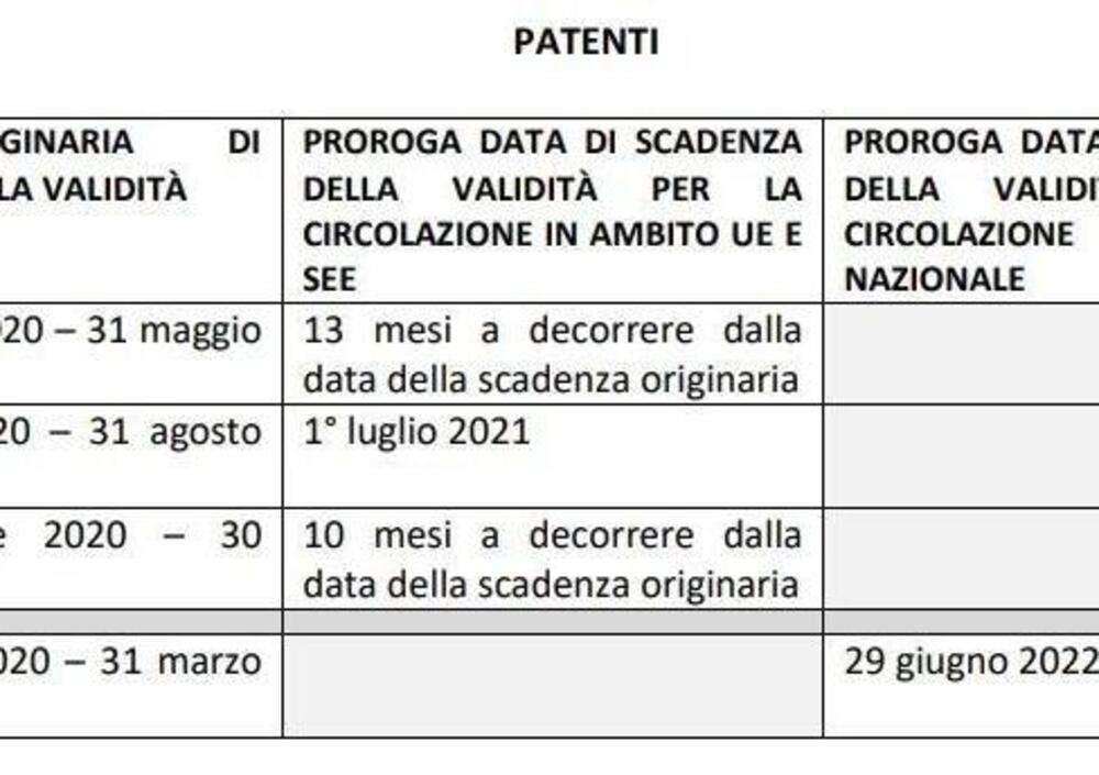 Per quanto riguarda le patenti di guida, la proroga di validità per la circolazione in Unione Europea era terminata ad aprile (per le scadenze dal primo settembre 2020 al 30 giugno 2021), mentre per la circolazione in ambito italiano la data limite era stata fissata il 29 giugno 2022: novantesimo giorno successivo al 31 marzo di quest'anno, data di cessazione dello stato di emergenza sanitaria in Italia.