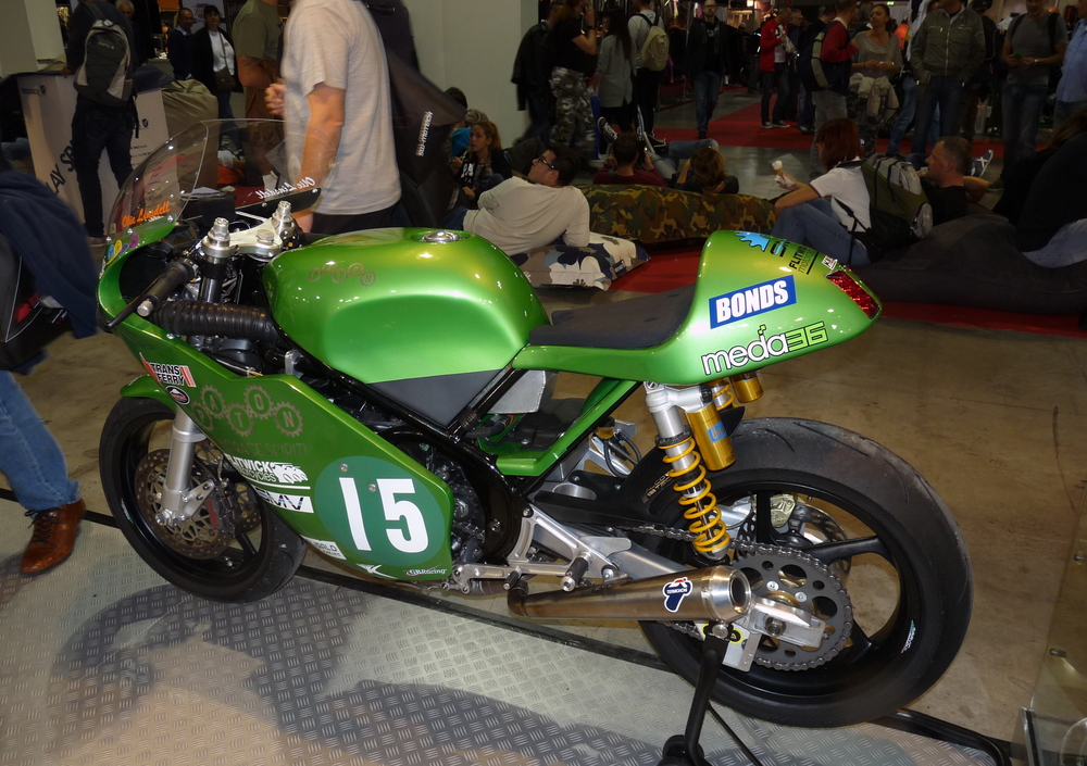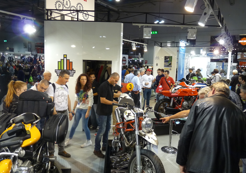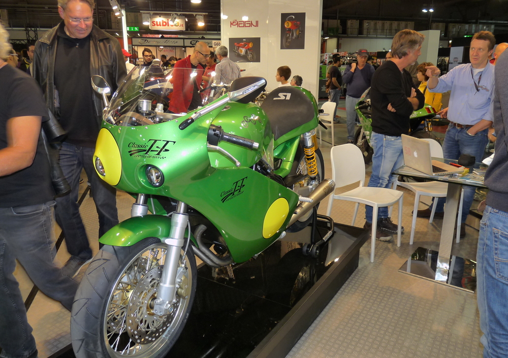Lo stand di Officina Moto Italia, quest’anno orfano di Zaeta, era presente ad EICMA con le novità di CR&S e Magni, e con la versione definitiva della Paton S1, la prima Paton stradale mai costruita, affiancata dalla versione racer preparata da Flitwick Motorcycles, che Oliver “olie” Lindsell ha portato al sesto posto assoluto al TT di quest’anno, nella categoria Lightweight, sfiorando i 250 orari di punta velocistica massima, quindi al top della sua categoria. Ricordiamo che la S1, apparentemente identica alla Paton 500 bicilindrica bialbero da GP degli anni 60, monta il motore Kawasaki 650 delle varie Versys ed ER-6, quindi anch’esso bicilindrico bialbero (a 8 valvole), ovviamente ospitato da una ciclistica vintage al pari dell’estetica. Ed è regolarmente omologabile per l’uso stradale.
