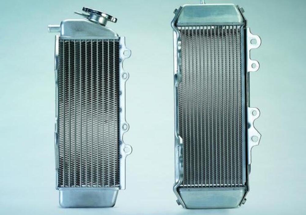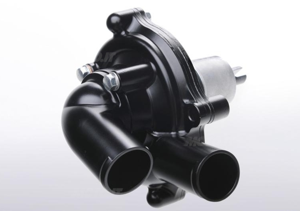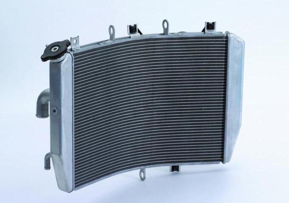 Tanto per cominciare, occorre dire che alla fine è sempre l’aria che asporta il calore. In questo caso però non lo fa direttamente, ma indirettamente, tramite l’acqua e un efficace scambiatore, il radiatore. Si parla spesso di raffreddamento a liquido (e non ad acqua) perché nei moderni sistemi refrigeranti non si impiega acqua pura (tranne che sulle moto da corsa, in quanto obbligatoria per l’impiego in pista), ma una miscela contenente antigelo e additivi anticorrosione. Questo fluido di raffreddamento assorbe calore dalla testa e dal cilindro, all’interno dei quali passa in apposite intercapedini ottenute di fusione, e lo trasporta al radiatore, ove lo cede all’aria. I moderni motori di prestazioni molto elevate sono invariabilmente raffreddati a liquido. Particolarmente importante è la capacità di asportare calore dalle zone critiche, inviando il fluido direttamente in prossimità delle sedi delle valvole, dei condotti di scarico e della parete esterna della camera di combustione, anche in presenza di angoli tra le valvole molto ridotti e di una notevole compattezza complessiva. Non è di minore rilevanza la possibilità di ottenere una grande uniformità nella distribuzioni delle temperature nella testa e tutto attorno al cilindro, con conseguente riduzione delle tensioni all’interno del materiale e della tendenza alle distorsioni. Come ovvio, è assolutamente fondamentale la possibilità di asportare una grande quantità di calore nell’unità di tempo, ossia di assicurare al motore un raffreddamento molto vigoroso ed efficace.