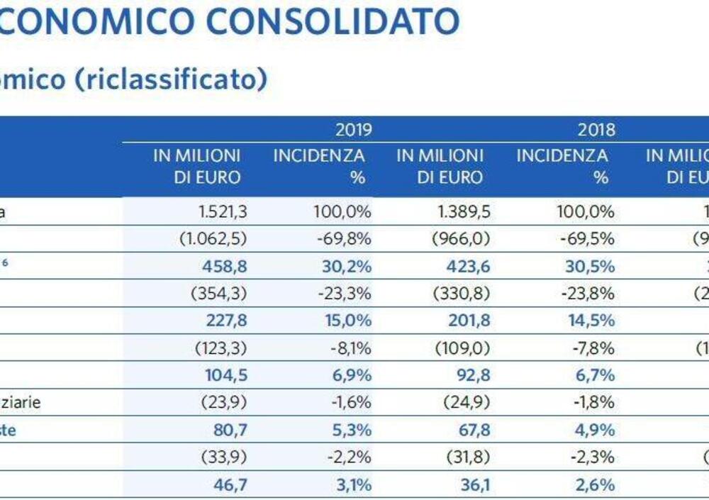 Gli utili prima delle imposte (Ebitda) sono stati di 227,8 milioni di euro (+12,9%), con una marginalità del 15%: è il risultato migliore dal 2006, anno della quotazione; l’Ebit è stato pari a 104,5 milioni di euro (+12,7%), con una marginalità del 6,9%; l’utile netto ha registrato una crescita del 29,6%, attestandosi a 46,7 milioni di euro.