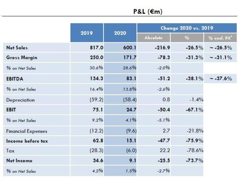 L’evoluzione del conto economico porta a un EBITDA consolidato di 83,1 milioni di euro, in contrazione del 38,1%(-37,6% a cambi costanti). L’EBITDA margin è pari al 13,8% (16,4% nel primo semestre 2019). Di 24,7 milioni di euro è il risultato operativo (EBIT), in calo del 67,1%rispetto ai 75,1 milioni di euro del semestre di confronto. L’EBIT margin è pari a 4,1% (9,2% al 30 giugno 2019).
