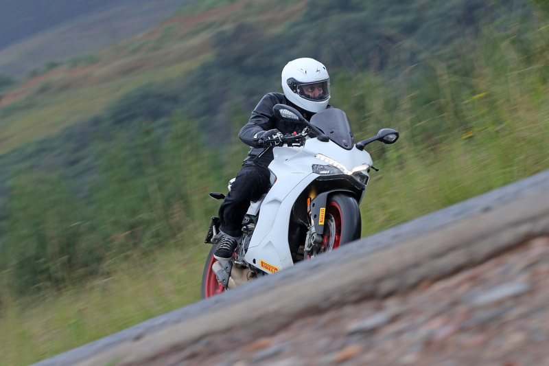 Gli intagli del battistrada sono presenti nella fascia centrale, e man mano che ci si sposta verso la spalla scompaiono letteralmente, garantendo quindi il massimo appoggio, paragonabile a quello di una gomma slick, quando si cercano le prestazioni in curva. Qui di massimi angoli di piega non se ne parla, l’asfalto bagnato, a tratti sporco di terra, ci fa apprezzare altre doti del Rosso Corsa II, come l’equilibrio garantito dai profili di anteriore e posteriore, caratteristica che permette inserimenti in curva e cambi di direzione lineari, mai troppo bruschi o troppo rallentati, bilanciamento che nella guida su bagnato è fondamentale. Così come è molto importante il grip offerto in condizioni meteo avverse, nel nostro caso pioggia e circa 10° di temperatura, che a dispetto anche di potenze che oltrepassano i 160 cv con badilate di coppia da mettere a terra, rimane sempre di tutto rispetto. Che il Diablo Rosso Corsa II sia una gomma votata alla guida sportiva lo si percepisce dalla struttura, o meglio dire la “carcassa”, piuttosto rigida, e poco propensa ad incassare le asperità della strada, ciò non toglie che garantisca sempre un’aderenza impressionante, e che si sposi molto bene come equipaggiamento di moto non propriamente pistaiole o sportive come per esempio le Ducati Multistrada presenti nel parco moto del test.