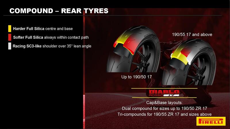 Dal 190/55 in poi, cioè da quelle misure che vengono calzate da moto di cilindrata e prestazioni maggiori, il battistrada viene suddiviso in cinque zone utilizzando tre mescole differenti: una mescola centrale, più dura, a elevato contenuto di silice garantisce per favorire il warm up e il grip chimico su fondo bagnato, una mescola intermedia Full Silica, più morbida di quella centrale, mentre la mescola delle spalle è 100% Carbon Black e deriva direttamente dalle mescole delle Diablo Supercorsa SC impiegate nelle competizioni endurance. Anche qui troviamo lo schema Cap&Base ma cambia anche la struttura che diventa in Lyocell a tre filamenti, con un basso rapporto di deformazione per dare supporto e spinta anche quando i 200 e oltre cavalli delle moderne maxi sportive e maxi naked chiedono tutto allo pneumatico.