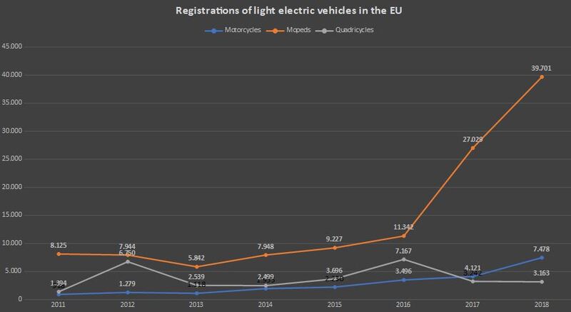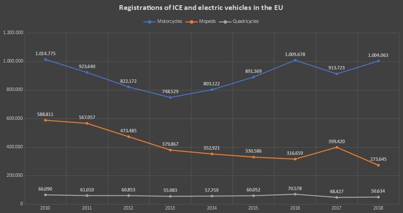 I motocicli elettrici venduti in Europa (scooter più moto) rappresentano soltanto lo 0,75% del mercato a motore termico. Tuttavia nel 2018 è cresciuto dell’81% toccando le 7.478 unità.