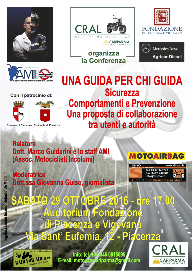 Partendo dal proprio volume “Una Guida per Chi guida”, il dott. Marco Guidarini, medico chirurgo, specializzato in Ortopedia e Traumatologia e presidente dell’Associazione Motociclisti Incolumi Onlus (AMI), assieme allo staff AMI Onlus, spiegherà i diversi aspetti coinvolti nella sicurezza stradale ed in che modo prevenire situazioni rischiose.