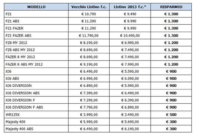 Ecco alcuni esempi: per acquistare la naked Yamaha FZ8 m.y. 2012 da oggi saranno sufficienti 6.990 euro f.c., con un risparmio netto rispetto all’ultimo listino dello scorso anno di ben 1.200 euro, arrivando a raggiungere un importo addirittura inferiore al prezzo di lancio di quella che fu 10 anni or sono la progenitrice dell’attuale naked sportiva, Yamaha FZ6 (proposta nel 2003 a 7.590 euro), una delle moto di maggior successo della storia per la casa nipponica.