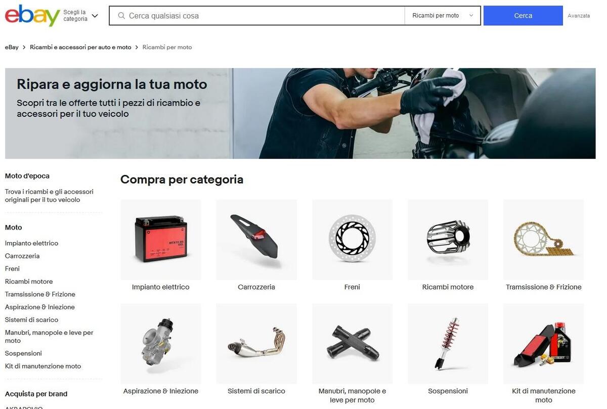 Parlando invece di componenti per la nostra cara moto su eBay c'è l'imbarazzo della scelta. La batteria è, per esempio, uno dei componenti che può abbandonarci durante una lunga sosta invernale, a questo link ce ne sono di tutti i modelli e per tutte le marche. Un altro valore aggiunto? Poter facilmente confrontare i prezzi tra i vari prodotti.