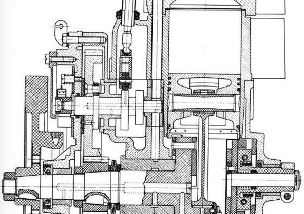 Anche all’interno del motore c’erano soluzioni inconsuete come la distribuzione con unica camma (che muoveva le aste agendo su bilancieri a dito dotati di rullo) e la lubrificazione a sbattimento. Niente pompa, insomma, ma un ingranaggio “pescatore” che non azionava nulla ma, parzialmente immerso nell’olio contenuto nella coppa, lo lanciava tutt’attorno! La potenza era di 7 CV a 5000 giri/min.