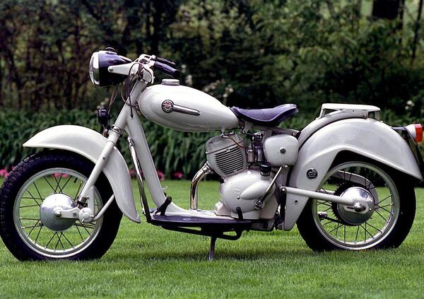 Tra le altre soluzioni spiccavano la sospensione anteriore a biscottini oscillanti e quella posteriore monobraccio. Nel motore, realizzato all’insegna della massima semplicità, la biella era montata a sbalzo (l’albero a gomito era quindi supportato solo da un lato perché l’altro non c’era!). La distribuzione era ad aste e bilancieri, con due valvole in testa inclinate. La prima versione di 160 cm3, che aveva un alesaggio di 62 mm e una corsa di 53 mm ed erogava 6 CV a 5200 giri/min, è stata rapidamente seguita da una di 175 cm3 e, dal 1954, da quella finale di 192 cm3, rimasta in listino fino a metà degli anni Sessanta.