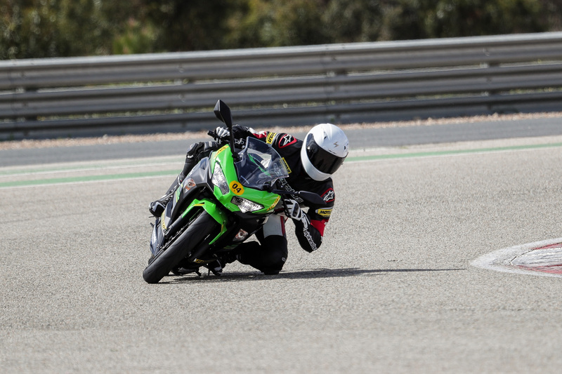 Poi ci si mette il meteo a fare i dispetti (quattro acquazzoni nell’arco di una giornata di test sono davvero snervanti), quindi cogliamo l’occasione per concederci la pausa pranzo. Il tempo di deglutire l’ultimo boccone e grazie al vento e al sole che si è riaffacciato, riusciamo a montare in sella a delle Kawasaki Ninja 400 che per l’occasione sono gommate rispettivamente con dei 110/70 e 140/70 (in alternativa si possono montare anche le 150), con pressioni di 2,1 anteriore e 2,25 posteriore. Su un tracciato più corto ci siamo divertiti come bambini sulle giostre, sfruttando la leggerezza e la rapidità della piccola Kawa nei cambi di direzione e in percorrenza di curva.