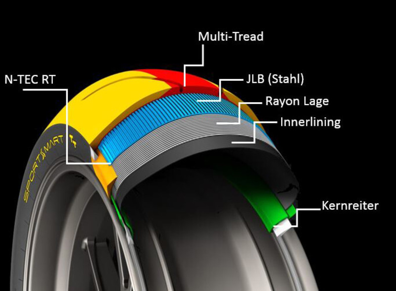 Come scritto sopra, alla bimescola posteriore si contrappone la singola anteriore, con la caratteristica comune della totale mancanza di silice, componente importante per raggiungere le massime prestazioni anche su asfalto bagnato, ma che può abbassare il livello prestazionale su asfalto asciutto, soprattutto in presenza delle elevate temperature di esercizio tipiche dell’utilizzo in pista. Non che lo SportSmart TT sia pericoloso sul bagnato, tutt’altro, ma i suoi obiettivi sono altri, e lo si evince anche dalla struttura stessa: la carcassa, come viene chiamata in gergo motociclistico, sfrutta la ben nota tecnologia JLB con avvolgimenti d’acciaio della struttura, e applica una evoluzione della tecnologia NTEC denominata NTEC RT (Road & Track).