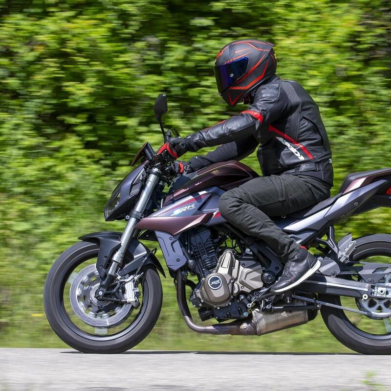 Le somiglianze sono palesi: linee retrò, il motore quattro cilindri in linea e l'iconica forma circolare del faro anteriore a LED. Il propulsore è lo stesso che alimenta la SRK 921 RR, lanciata sul mercato cinese all'inizio del 2024, con una cilindrata di 921 cc (alesaggio e corsa di 73 x 55 mm).