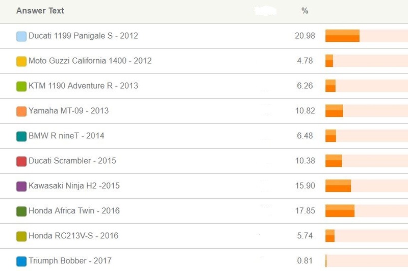 I vostri voti hanno premiato la Ducati 1199 Panigale S, che ha preceduto la Honda Africa Twin e la Kawasaki Ninja H2.