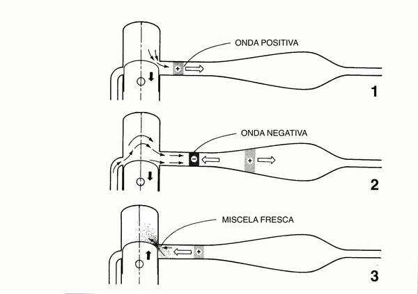 Quando il pistone scopre la luce una forte onda di pressione positiva inizia a percorrere il sistema di scarico. L’aumento di sezione nel tratto divergente della marmitta fa nascere un’onda riflessa negativa che torna alla luce di scarico e migliora il lavaggio richiamando i gas combusti fuori dal cilindro. Continuando a propagarsi, l’onda positiva arriva al tratto convergente del sistema di scarico dove viene riflessa con lo stesso segno e torna verso cilindro.