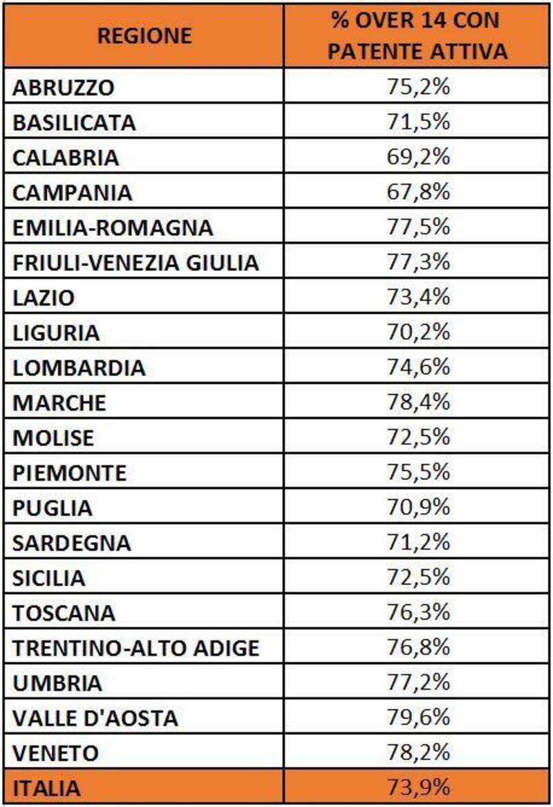 Rapportando il numero di patenti di guida attive con quello degli over 14 residenti in Italia emerge che il 73,9% della popolazione è abilitato alla guida di un veicolo a motore.