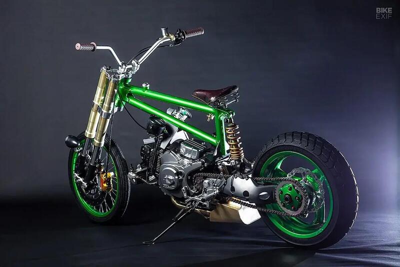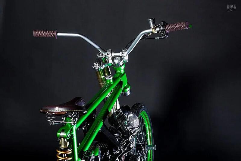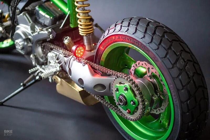 Il bicilindrico Pantah è stato letteralmente smembrato: via un cilindro, alesaggio maggiorato sull’altro e trasformazione in un monocilindrico da 426 cc. Cambio rivisto, frizione automatica, raffreddamento migliorato e una ciclistica che sembra uscita da uno skate park più che da una officina custom. Il telaio è ispirato alle BMX, la forcella è un incredibile monobraccio doppio autocostruito, mentre dietro troviamo un forcellone monobraccio Ducati.