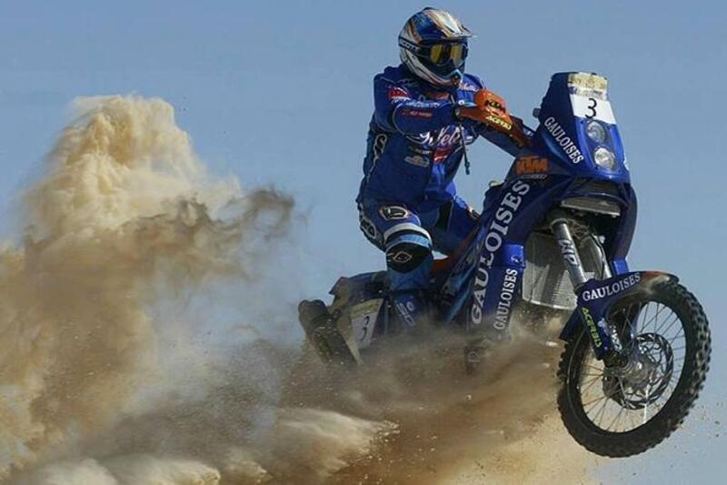 Il canto del cigno nel 2002. L’indimenticabile Fabrizio Meoni, che ha vinto con il mono l’anno prima, torna e vince ancora con la KTM 950 LC8 Rally, due cilindri a V di 75 gradi, 185 chili per 100 cavalli. Ancora leggenda.
