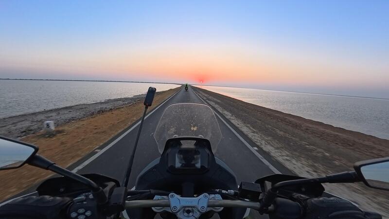 Cosa me ne frega delle curve quando ho l'illusione che non ci sia terra alla fine di questo rettilineo e che questa sensazione possa durare per sempre, quando spero che “Road to Heaven” dica la verità e l'utopia di stare per provare un'esperienza extracorporea e sovrasensoriale vuole sopraffare la mia razionalità. Si dice sia la strada più panoramica dell'India, di certo è quella con più moscerini. Me ne frego, oggi è uno di quei giorni che ricorderò per sempre, sulla RTX a 90 all'ora, con i fenicotteri a sinistra che spiccano il volo tutti insieme, i pensieri confusi, l'odore di salmastro che mi tiene sveglio perché per arrivare qui a salutare l'alba mi sono svegliato alle 4:00, l'emozione di cavalcare il lago, di perdersi e poi di ritrovare se stessi come in Notturno Indiano; il sole talmente basso da giustificare il miraggio che alla fine di questo infinito rettilineo sia ancora buio. E io, credetemi, non ho paura del buio.