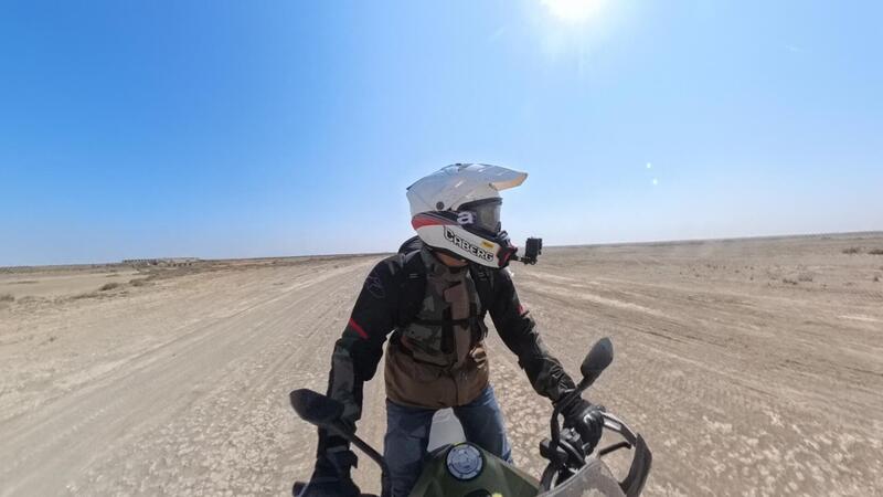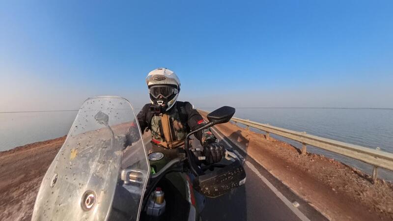 Immaginate un rettilineo di 30 chilometri circondato da un lago che a destra è increspato ma a sinistra non so per quale sortilegio, no. Questa lingua d'asfalto che unisce Khavda a Dholavira ha scavato un solco nelle mie esperienze in moto e reso meno ferrea la convinzione che in moto una strada senza curve sia trascurabile.
