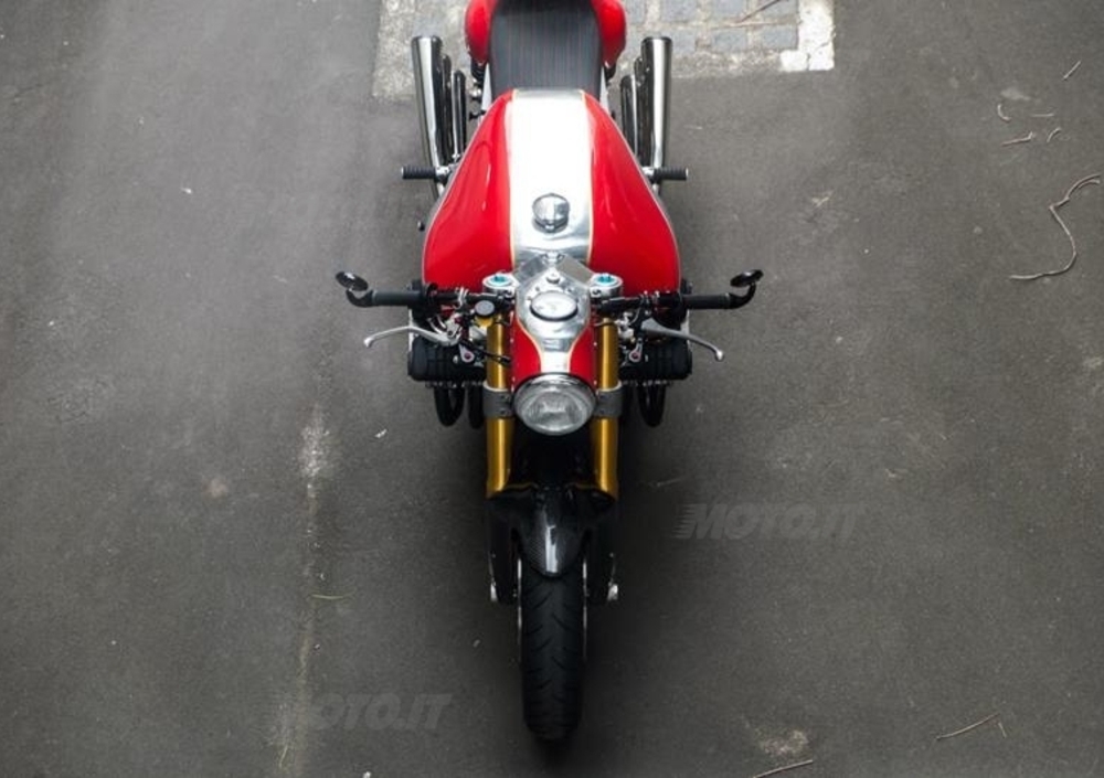 Il telaio è stato privato di tutti gli attacchi inutili, mentre il forcellone è stato allargato e rinforzato con tubi in acciaio a sezione ovale; i comparti sospensioni ed impianto frenante sono quelli di una Ducati 1098R - ovviamente con due monoammortizzatori Ohlins invece di uno. Pedane, leve e comandi provengono da Domino o Tarozzi con qualche tocco Deus Ex Machina. I cerchi provengono rispettivamente da una 1098R l'anteriore e da una 999 il posteriore. Lo scarico è stato realizzato da Pipemaster con un tocco finale apportato dal proprietario.