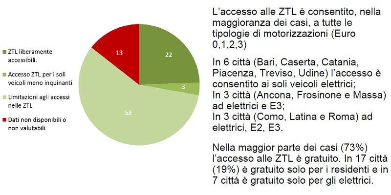 L’accessibilità alla ZTL per motocicli e ciclomotori è possibile in 85 comuni (erano 92 nel 2015), ma con alcune limitazioni: ad esempio, entrano solo gli elettrici a Bari, Caserta, Catania, Piacenza, Treviso e Udine. Ad Ancona, Frosinone, e Mazza entrano gli elettrici e gli Euro 3. Nelle ZTL di Roma, Como e Latina accedono gli elettrici, gli Euro2 e gli Euro3.