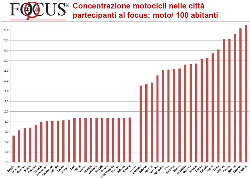 L’importanza dei motocicli nella mobilità cittadina è misurata dalla concentrazione di veicoli ogni 100 abitanti. Oltre 26 motocicli/100 abitanti si registrano a Imperia e Livorno, oltre 24 a Savona, Pesaro e Genova, oltre 20 a Siena, Rimini, Catania e Trieste.